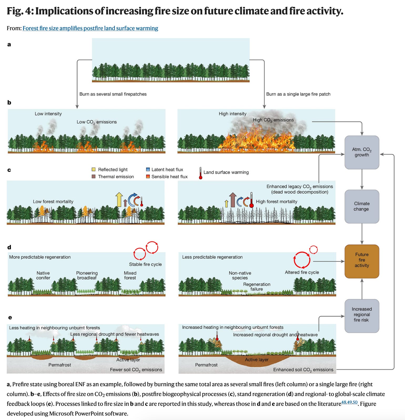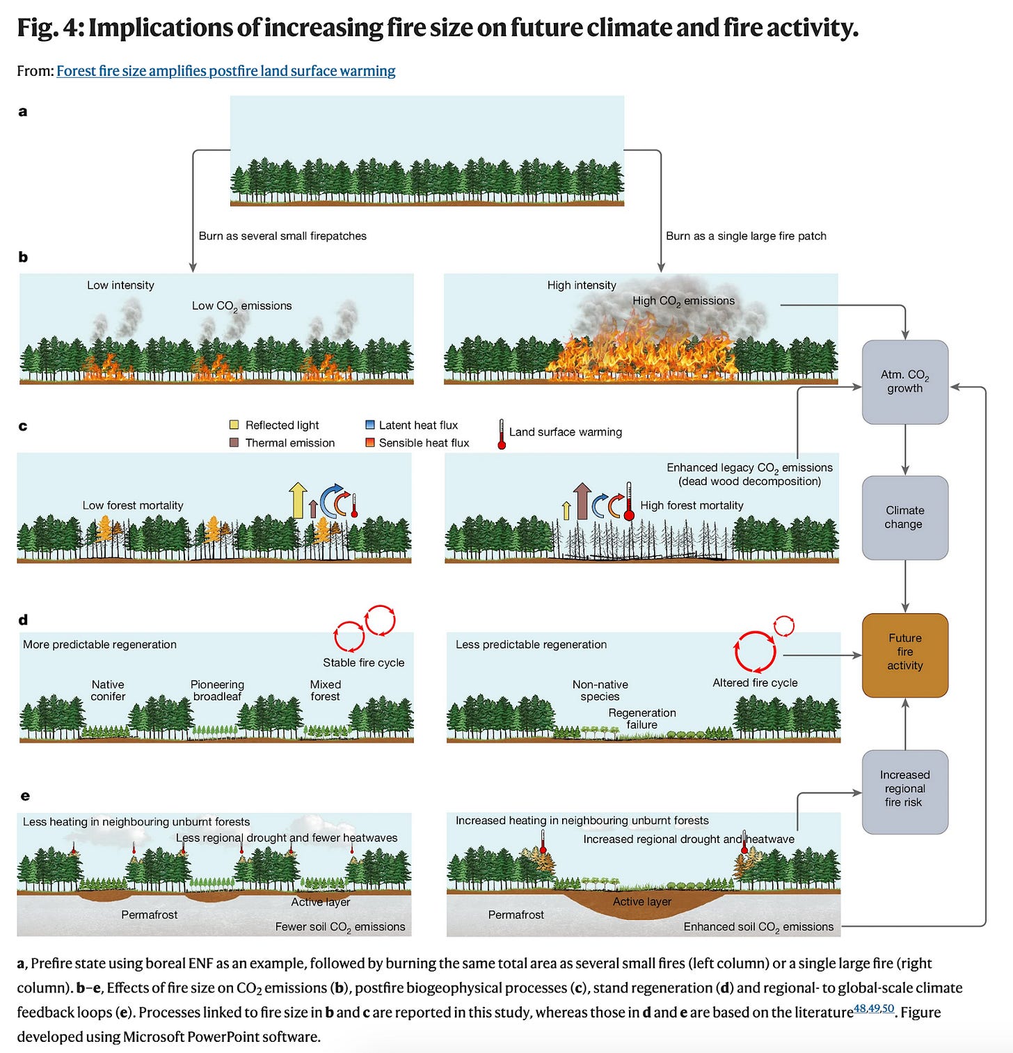 Scientists showed that large fires (which are increasingly common) raise local land temperatures for decades in part because of the darkening of the ground surface and removal of the forest canopy. The temperature increase was found to impact postfire stand regeneration. "Climate-smart forestry should aim to mitigate the climate risks of large fires.”